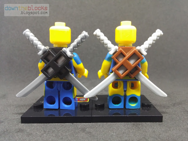 The back view. Sorry about the lighting, but DLP's swords are more on the dark grey side while KL's are more on the light grey. I doubt those would matter too much though. Also, if you haven't noticed, the sword sheaths/packs are different: black for DLP and brown for KL. Again, it shouldn't matter a lot.
